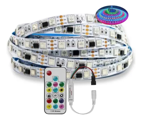 Fita de LED RGB WS2811 com 60 LEDs por metro. Ideal para projetos decorativos e iluminação personalizada, oferece cores vibrantes, corte a cada 4,5 cm e fácil instalação com fita dupla face. Funciona em 12V DC