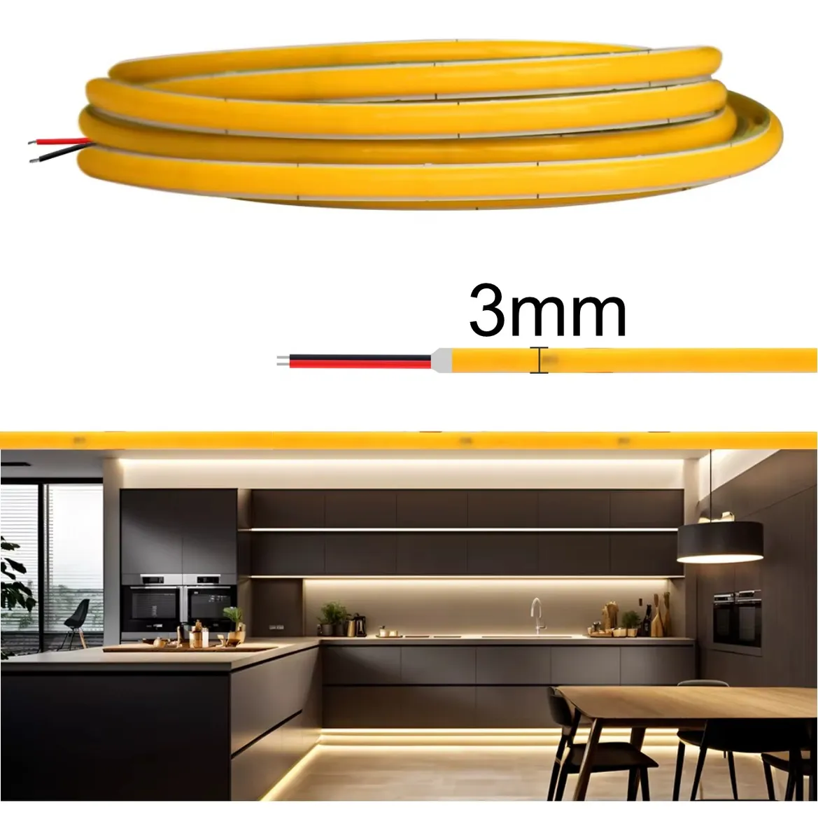 A Fita de LED COB 12V 3mm é uma solução moderna e compacta para projetos de iluminação decorativa e técnica. Com apenas 3 mm de largura, é ideal para aplicações onde o espaço é reduzido, permitindo instalação discreta em perfis estreitos, móveis planejados, nichos, vitrines e detalhes arquitetônicos.