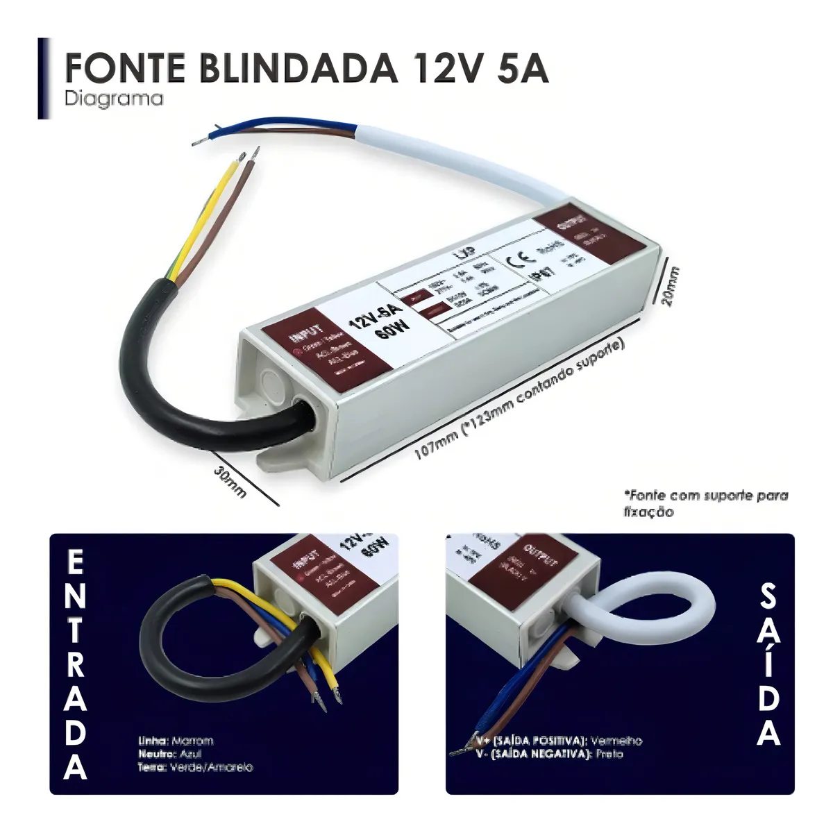 A Fonte Blindada 60W 12V é uma solução compacta e eficiente para alimentação de equipamentos eletrônicos que operam em 12V DC. Desenvolvida com carcaça selada e resistente, oferece maior proteção contra poeira, umidade e interferências externas, garantindo maior segurança e durabilidade.