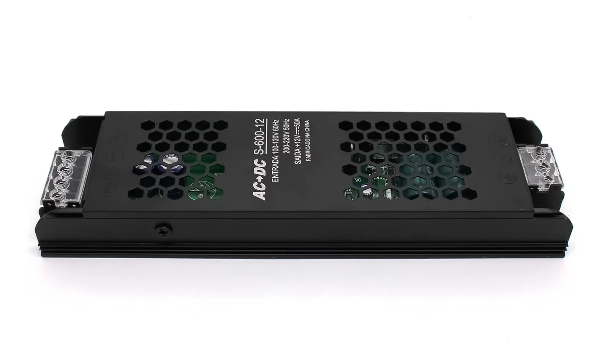 Seu design slim (perfil ultrafino) permite instalação em locais com espaço reduzido, como perfis de LED, estruturas metálicas e painéis elétricos. Fabricada com carcaça metálica resistente e ventilação eficiente, proporciona melhor dissipação de calor e maior durabilidade.