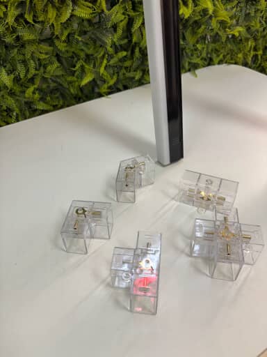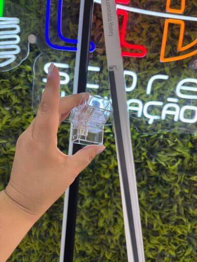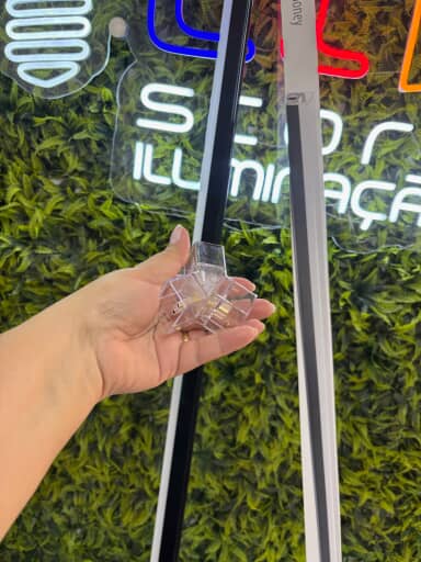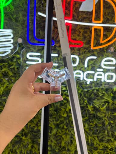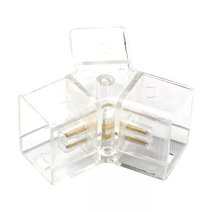 Conector tipo “Y” para luminárias T5 Honey, ideal para dividir a linha de iluminação em dois sentidos. Material resistente e transparente, uso interno (IP20).
