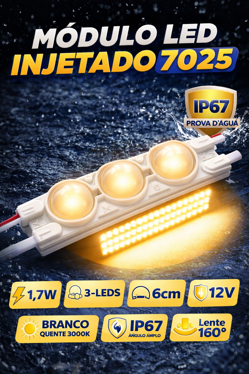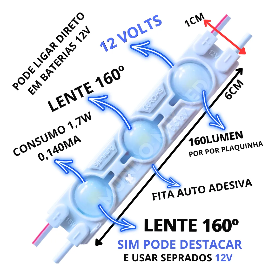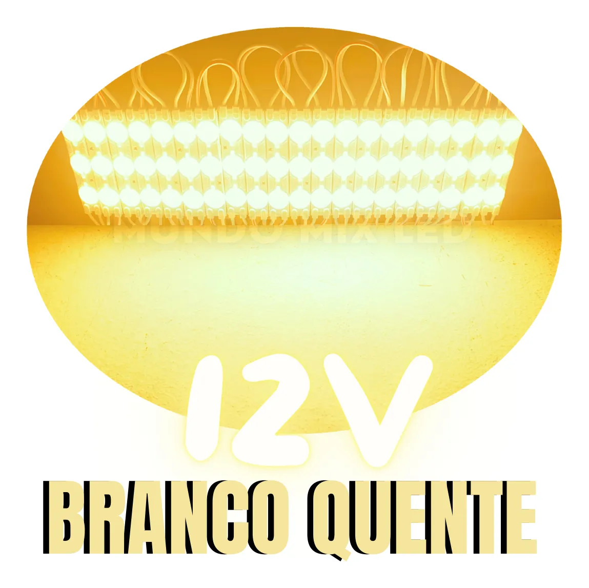 O módulo LED com lente 3 LEDs 1,7W 12V branco quente é ideal para quem busca alto brilho, economia e excelente acabamento em iluminação de letras caixa e fachadas.