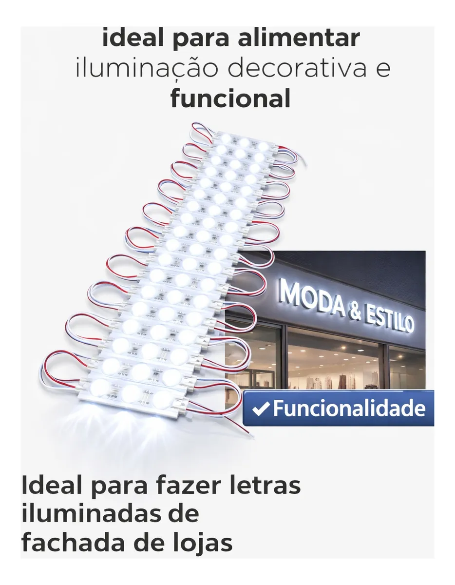Equipado com LEDs de tecnologia coreana, garante alto brilho com baixo consumo, além de excelente durabilidade. Sua lente difusora proporciona um efeito de iluminação homogêneo, eliminando pontos marcados — perfeito para letras caixa e fachadas.