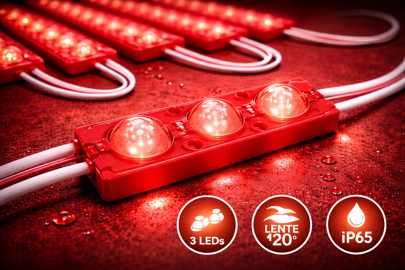Módulo LED com lente difusora de alta eficiência, desenvolvido para aplicações em comunicação visual como letras caixa, fachadas e painéis luminosos. Oferece iluminação intensa na cor vermelha, com excelente uniformidade e baixo consumo energético.