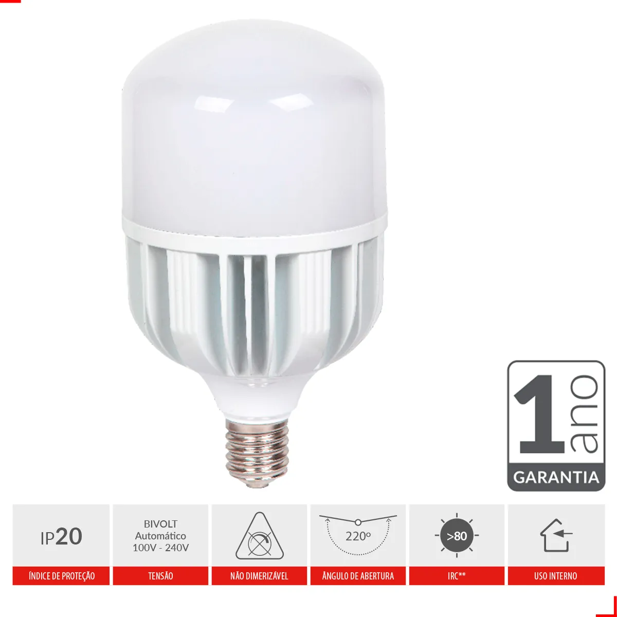 Possui base padrão E27, permitindo instalação simples em luminárias compatíveis com lâmpadas de alta potência. Seu amplo ângulo de abertura proporciona iluminação uniforme em grandes ambientes.