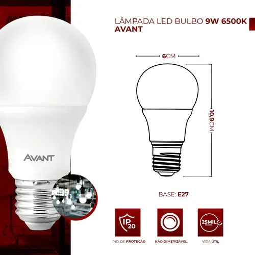 A Lâmpada LED Bulbo Avant 9W Branco Frio oferece iluminação eficiente, econômica e de alta durabilidade, sendo ideal para ambientes residenciais e comerciais. Com tecnologia LED de alto desempenho, proporciona luz branca intensa e uniforme, perfeita para locais que necessitam de maior luminosidade, como cozinhas, escritórios, áreas de trabalho, corredores e lojas.