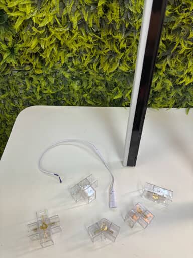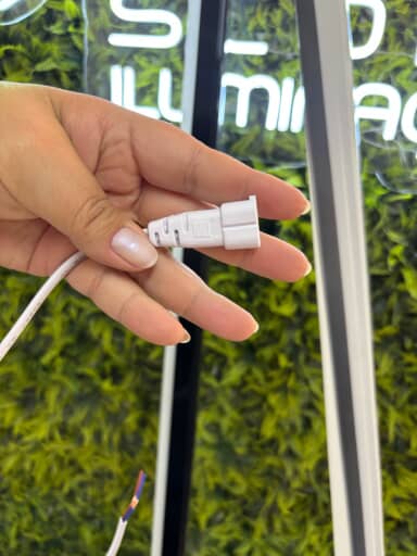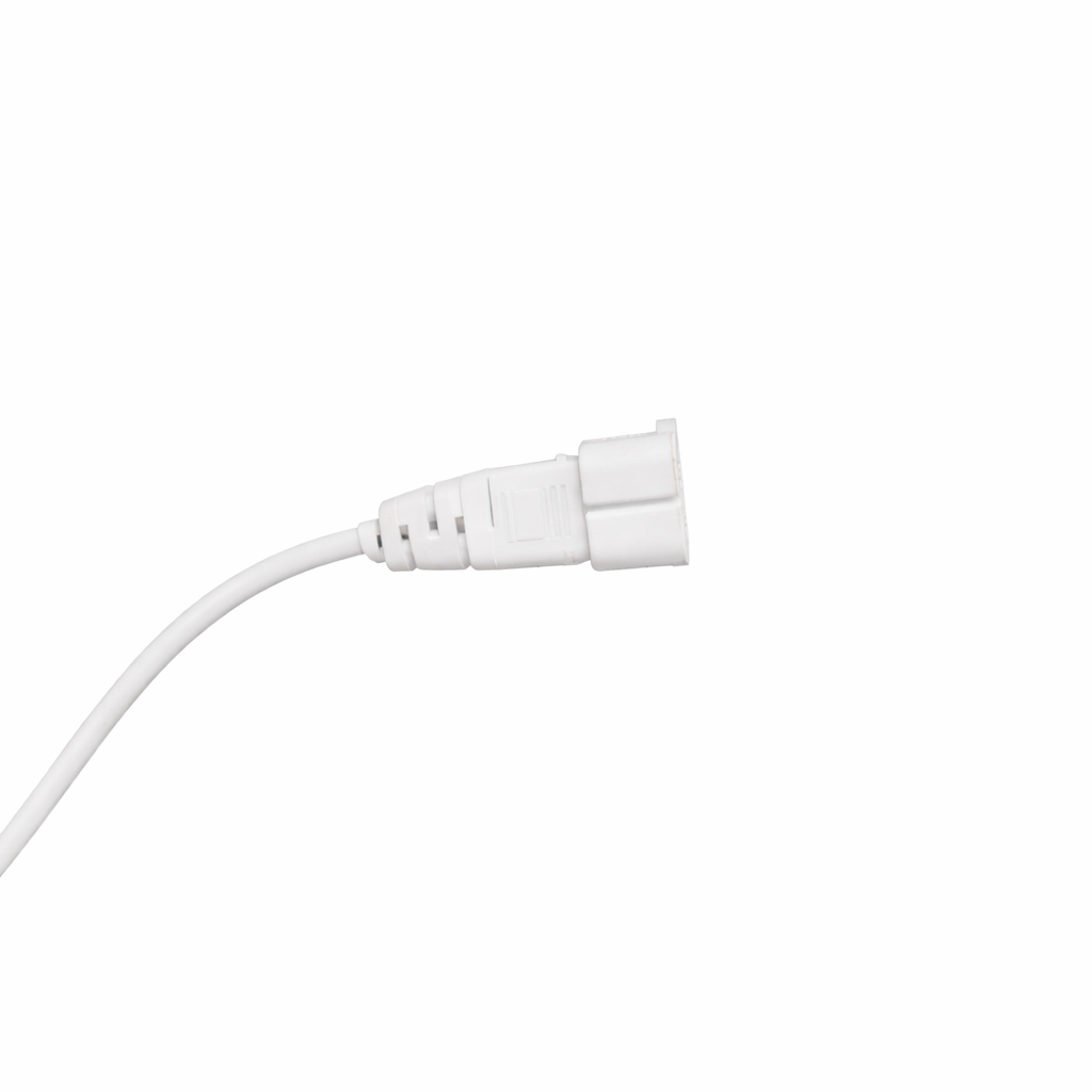 Plug conector para luminárias T5 HONEY, ideal para realizar ligações seguras e práticas entre módulos de iluminação. Produzido em ABS branco resistente, é indicado para uso interno e garante uma conexão firme e durável.