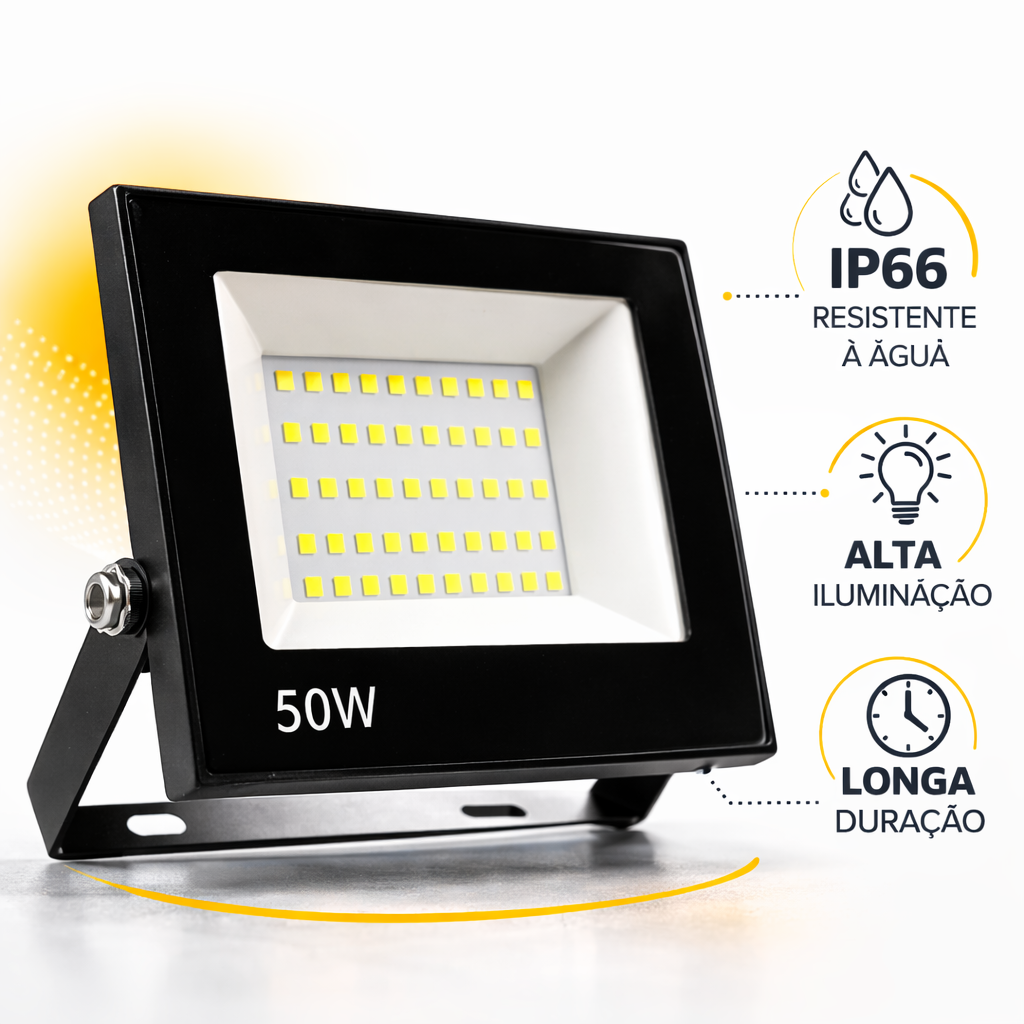 Fabricado com carcaça em alumínio e lente de vidro temperado, o refletor possui excelente dissipação de calor, garantindo maior durabilidade. O grau de proteção IP66 oferece resistência contra poeira e jatos de água, tornando o produto adequado para uso em áreas externas.