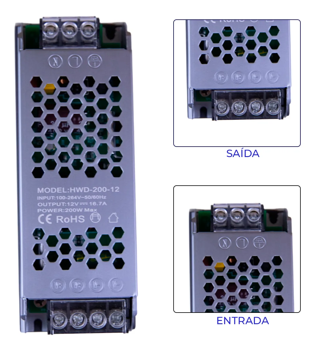 Produzida com tecnologia de fonte chaveada, converte a energia da rede elétrica em corrente contínua de forma eficiente, proporcionando menor consumo de energia, maior estabilidade de tensão e melhor dissipação térmica. Esse modelo fornece até 16A de corrente e potência aproximada de 200W, sendo ideal para aplicações em fitas de LED, módulos de LED, comunicação visual e automação eletrônica.