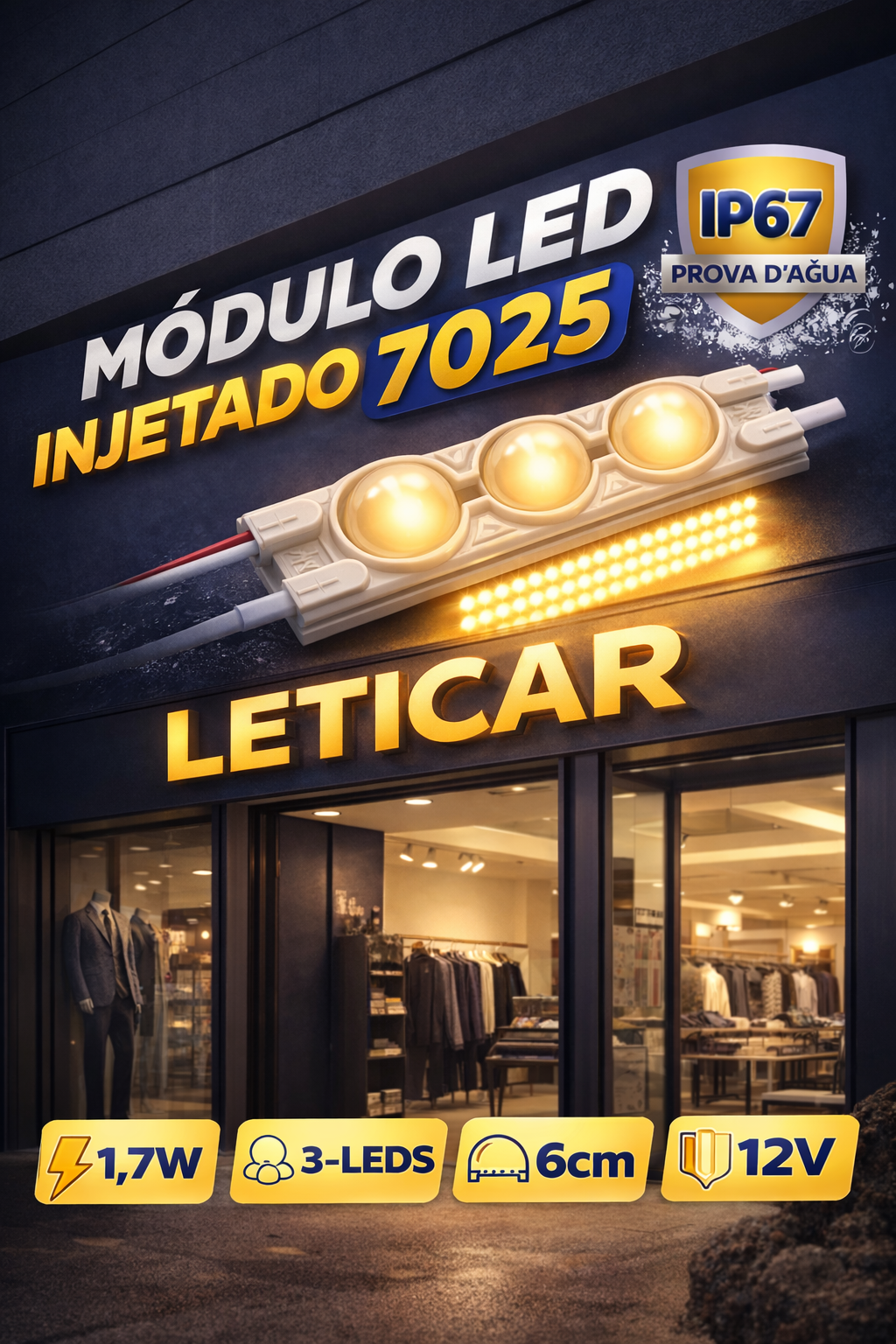 O módulo LED com lente 3 LEDs 1,7W 12V branco quente é ideal para quem busca alto brilho, economia e excelente acabamento em iluminação de letras caixa e fachadas.
