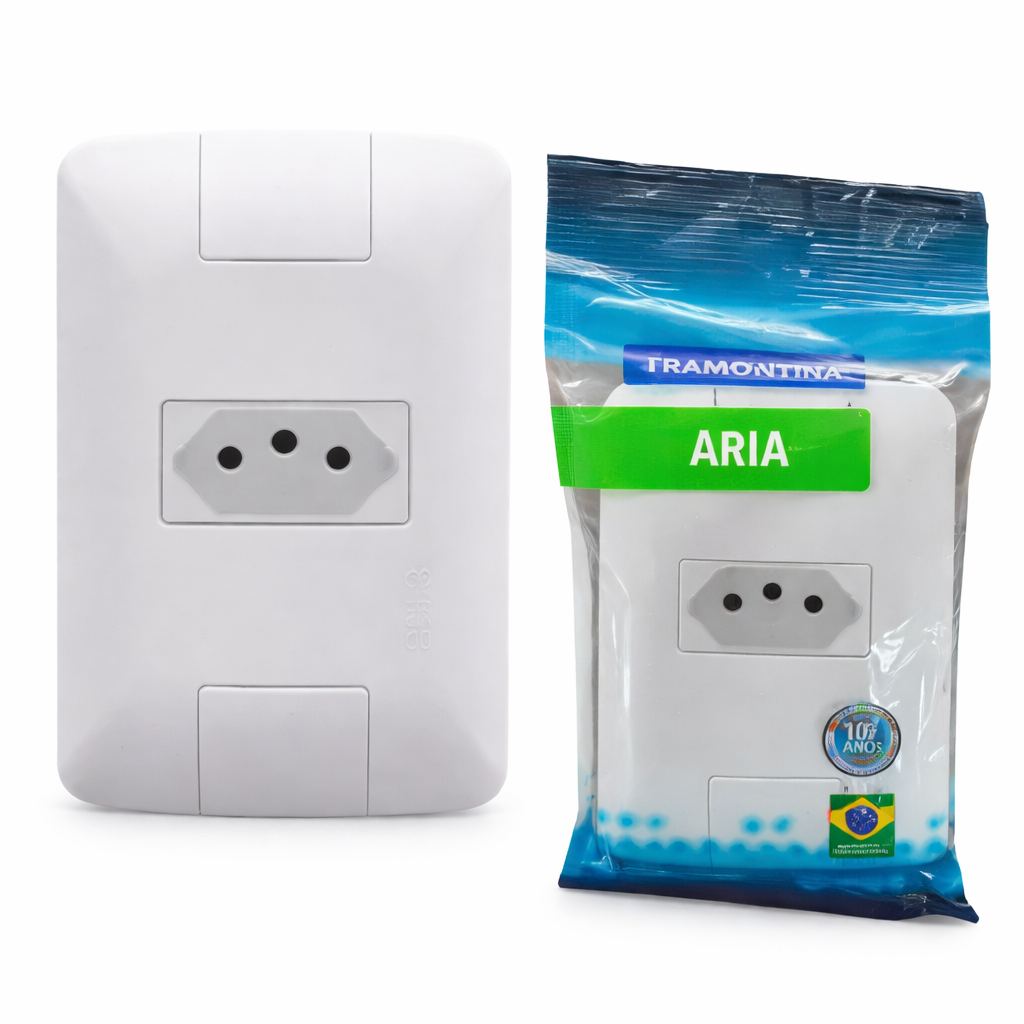 Kit com 10 tomadas padrão brasileiro 2P+T (10A) da linha Aria Tramontina. Produto ideal para instalações residenciais e comerciais, com acabamento moderno, alta durabilidade e segurança elétrica.